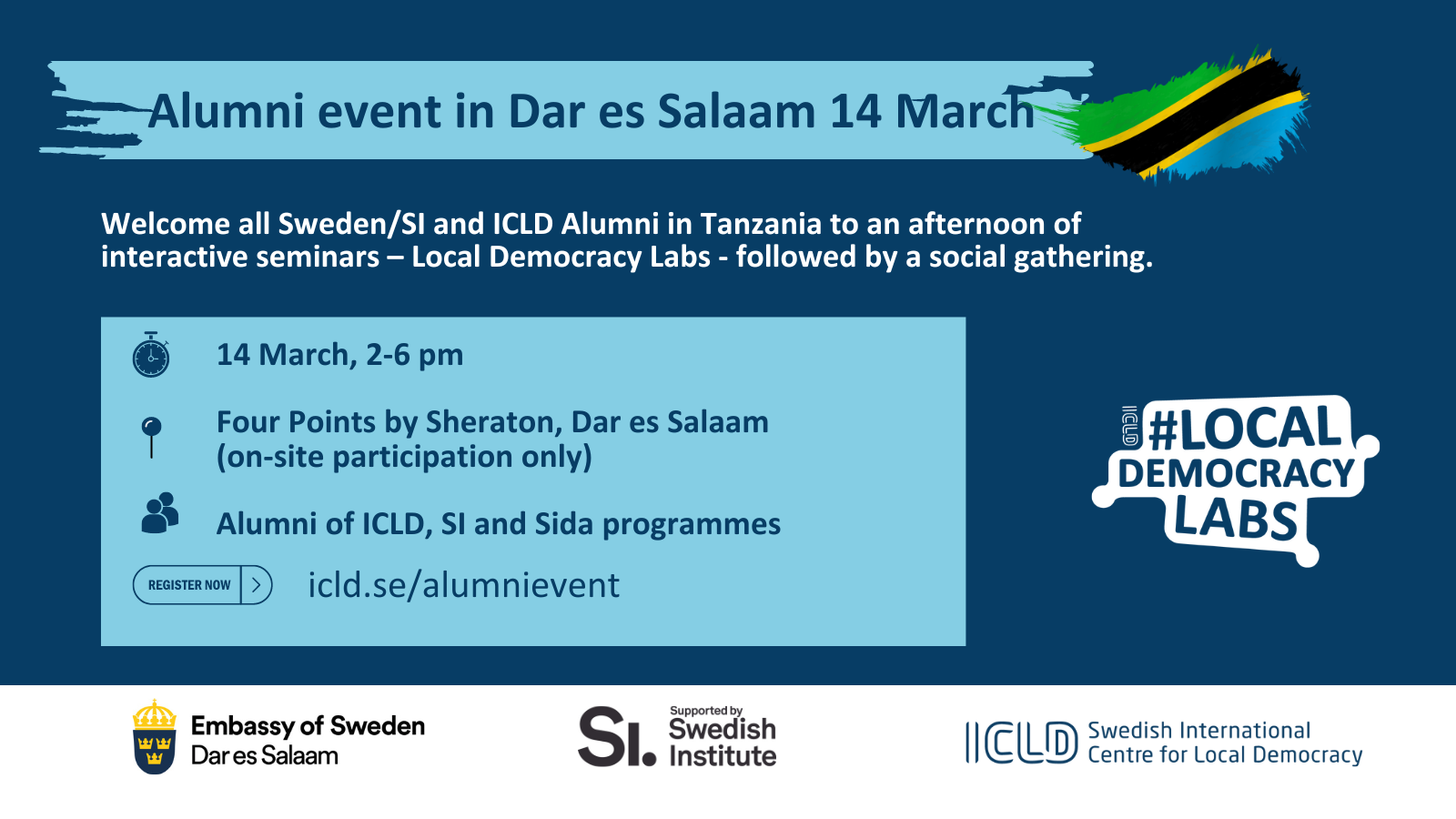 The event is open for: Sweden/SI and ICLD Alumni in Tanzania. The event is free of charge but ICLD cannot cover any transportation or accommodation.