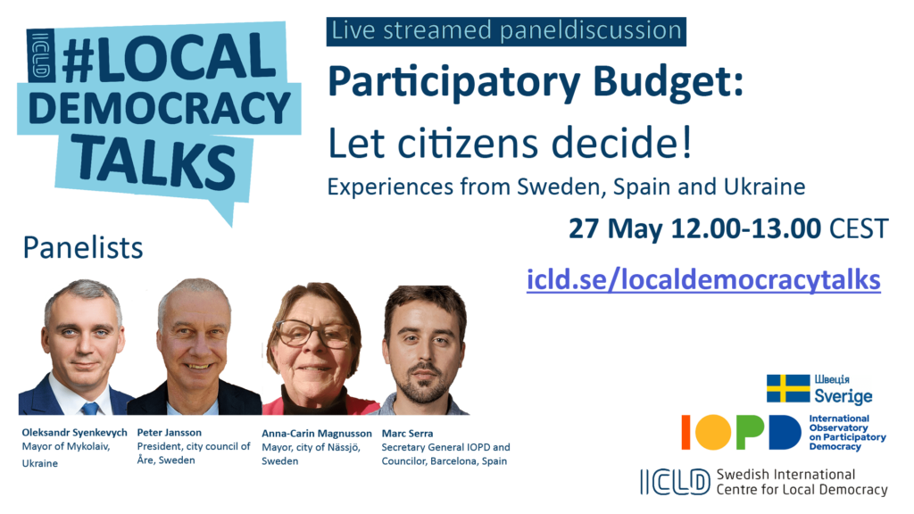 This high-level panel brought together a group of leading politicians from the cites of Nässjö and Åre in Sweden, Barcelona in Spain, and Mykolaiv in Ukraine to share their personal stories on the value of letting people decide over the municipal budget. What are their motivations? Why do they believe in participatory budget? What are the limitations and what can be achieved? These are some of the questions discussed during the panel that was attended by 46 people online from 10 different countries.