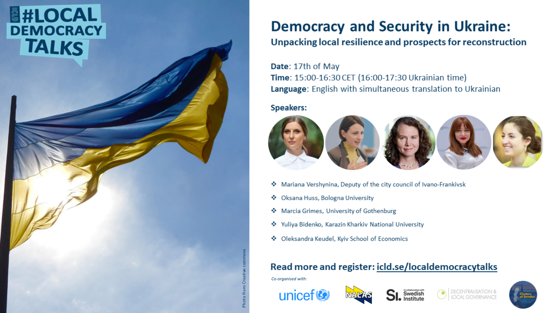 Conventional security discourses did not predict the magnitude and endurance of resistance efforts in Ukraine, considering the asymmetry between Russia and Ukraine in terms of military capacity. Based on our own research on local democracy in Ukraine, we propose that sweeping decentralization reforms combined with widespread multipronged democratic innovations, including a digital transformation of the state, in recent years has significantly contributed to Ukraine’s resilience. The purpose of the event is to revisit the state of Ukrainian local democracy before the war and discuss how this has contributed to the resilience and problem-solving capacity that we see today.