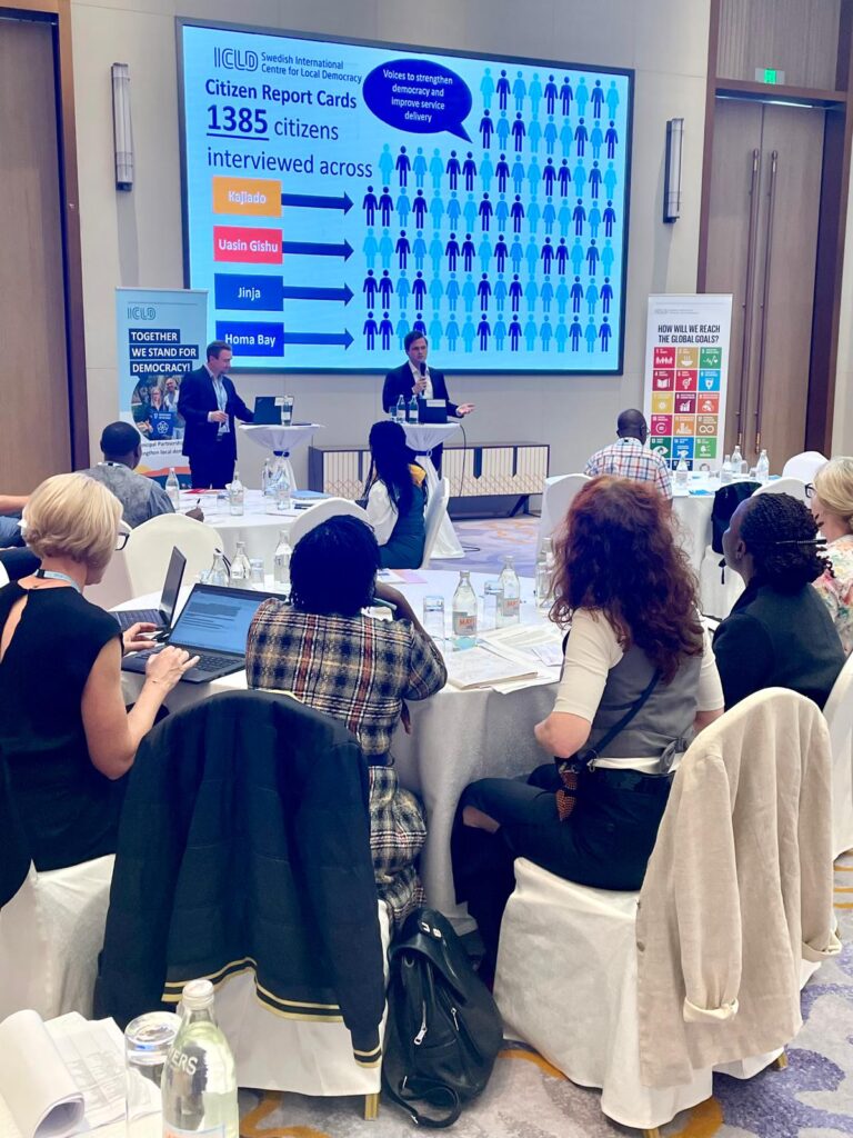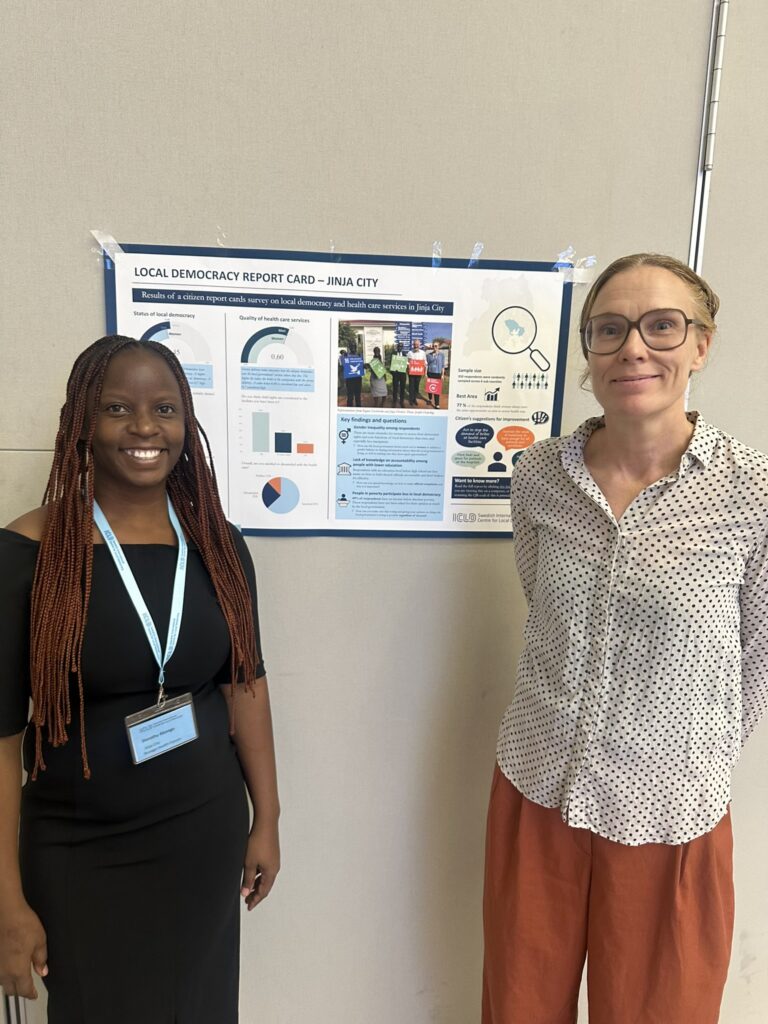 In October 2024, ICLD held an Equitable Health Network Conference held in Nairobi, Kenya, where the results of the Jinja Citizen Report Card (CRC) survey were shared with attendees. Representing the Municipal Partnership between Jinja District and Region Stockholm, Dorothy Akongo and Helena Hildenwall presented the findings, showcasing the collaborative efforts to improve local democracy and health care services. Here are their photos with the CRC poster.