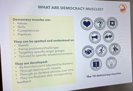 Det finns tio demokratiska muskler som vi alla har och behöver för att hålla demokratin levande och allas vår individuella medverkan och ansvar för att upprätthålla demokratin i samhället. Det är ju inte fysiska muskler utan det handlar om aktivt lyssnande, kompromisser, nyfikenhet, mod, verbal trygghet och empati, med flera egenskaper som är avgörande för att vi ska värna om och förvalta demokratiska institutioner och samhällen.