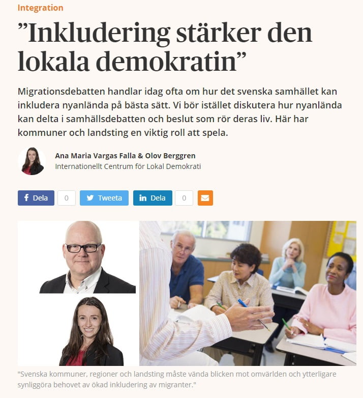 ”Migrationsdebatten handlar i dagsläget ofta om hur det svenska samhället kan inkludera nyanlända på bästa sätt. Vi bör istället diskutera hur nyanlända kan delta i samhällsdebatten och beslut som rör deras liv. Här har kommuner och landsting en viktig roll att spela. Det är dags att börja betrakta migranter som aktiva medlemmar av vårt samhälle och som nödvändiga för att säkerställa en representativ demokrati.”